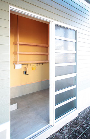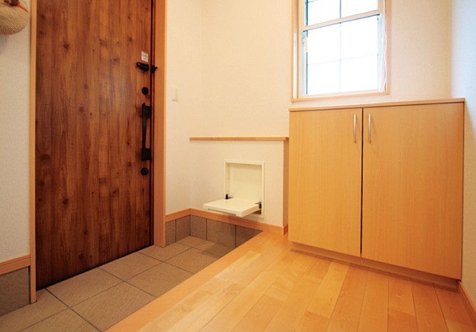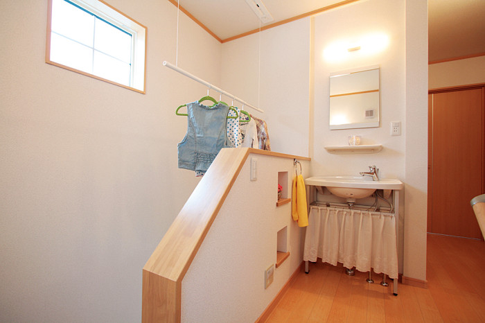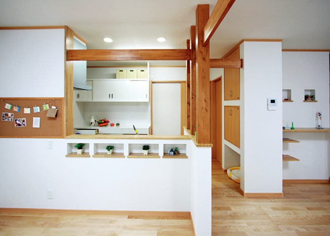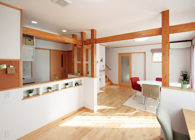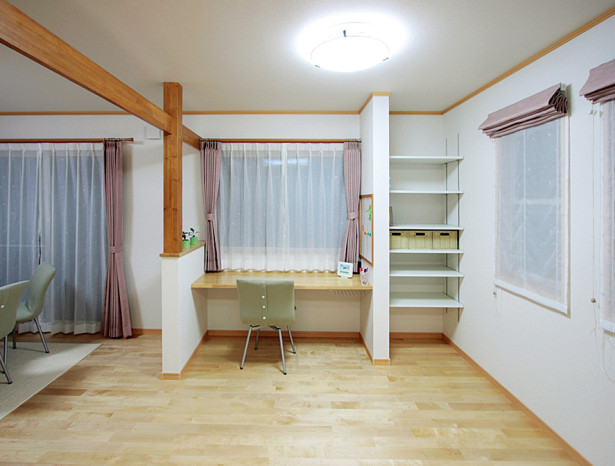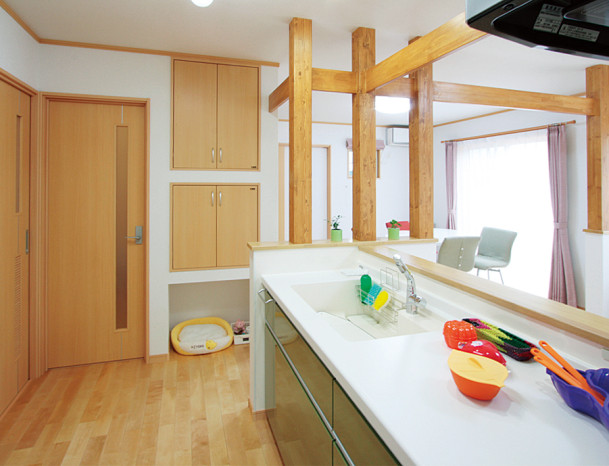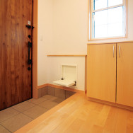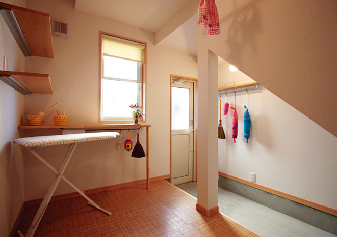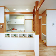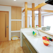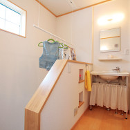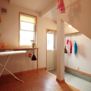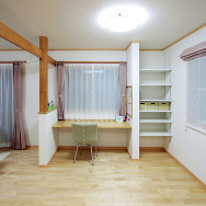 そんな思いから、女性目線で一日の生活をシミュレーションしながら、女性スタッフとOB会員様の要望を取入れた家造りを進めました。収納と家事動線に視点をおき、ストレスを感じることなく家事ができる動線と、部屋ごとに用途や目的に合った使い易い収納を取入れ、便利な暮らしの出来る住宅です。さらに太陽光発電システム設置によるオール電化住宅。省エネで環境と健康に優しいエコハウスは、小さい中にもアイディアがいっぱい詰まった住宅です。