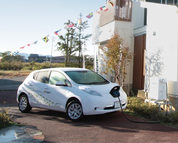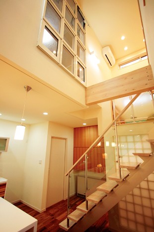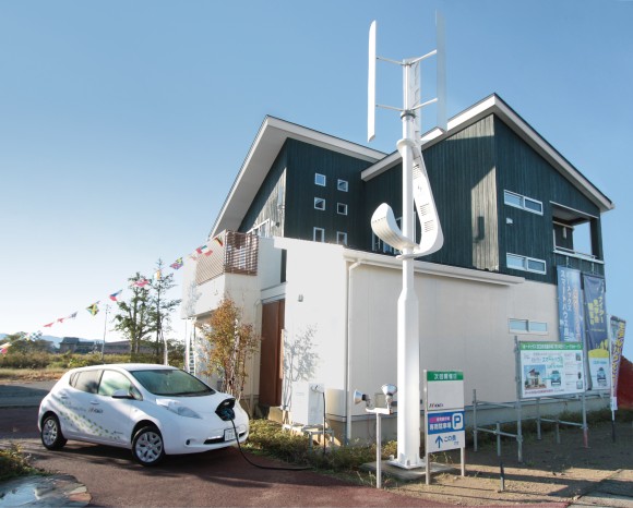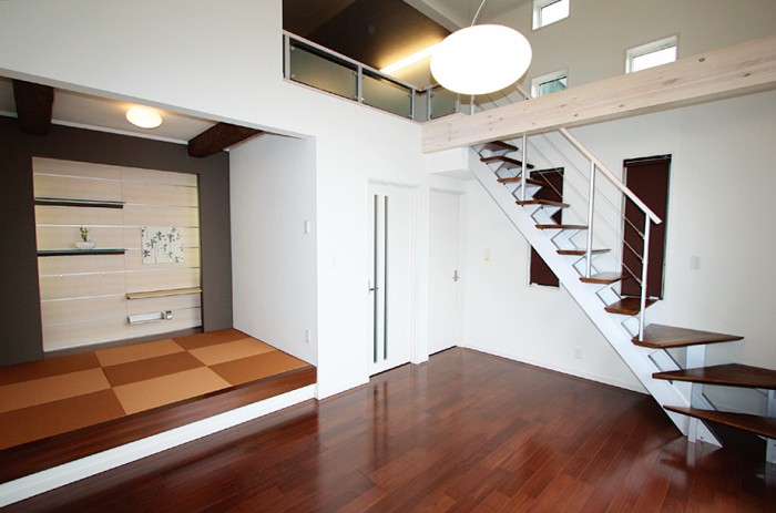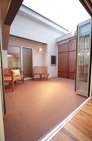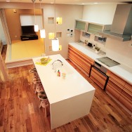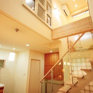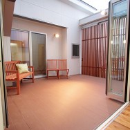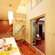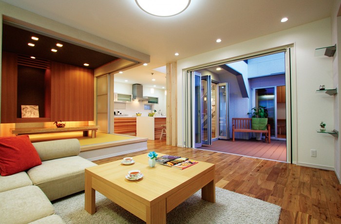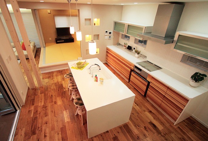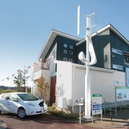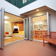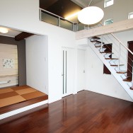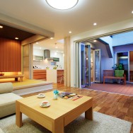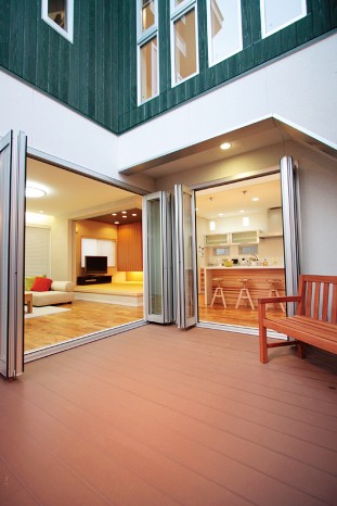 モスグリーンとホワイトのツートンカラーでまとめたモダンでスタイリッシュな外観。パティオ(中庭)を中心として、家中に光と風を取り込むことのできる空間構成。スッキリとした玄関まわりと多種多様に異なる素材がバランスよく組み合わさったインテリアなど、毎日、手に触れるもの、目に見えるものにデザインを感じることができます。ディテールにこだわり、美しさと空間のつながりをデザインした室内では、家事や育児に効率的な動線や健康に配慮した建材、収納スペース等の様々なアイディア、光熱費を抑えるエコ設備など、子育てファミリーが将来家を建てる際のヒントがいっぱい詰まったモデルハウスです。
