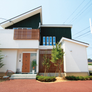 モスグリーンとホワイトのツートンカラーでまとめたモダンでスタイリッシュな外観。パティオ(中庭)を中心として、家中に光と風を取り込むことのできる空間構成。スッキリとした玄関まわりと多種多様に異なる素材がバランスよく組み合わさったインテリアなど、毎日、手に触れるもの、目に見えるものにデザインを感じることができます。ディテールにこだわり、美しさと空間のつながりをデザインした室内では、家事や育児に効率的な動線や健康に配慮した建材、収納スペース等の様々なアイディア、光熱費を抑えるエコ設備など、子育てファミリーが将来家を建てる際のヒントがいっぱい詰まったモデルハウスです。