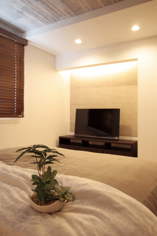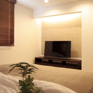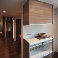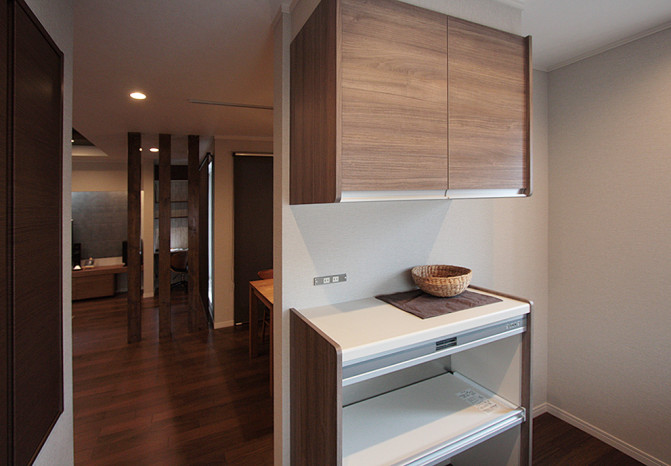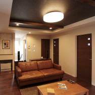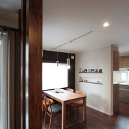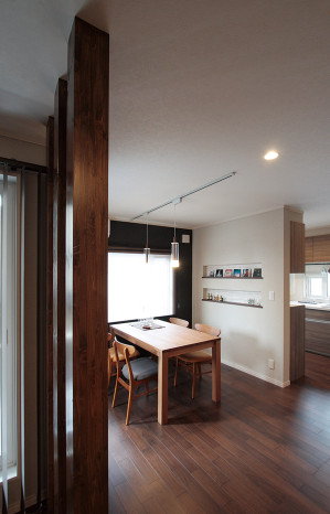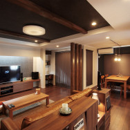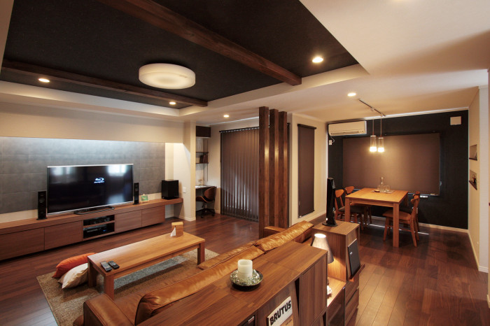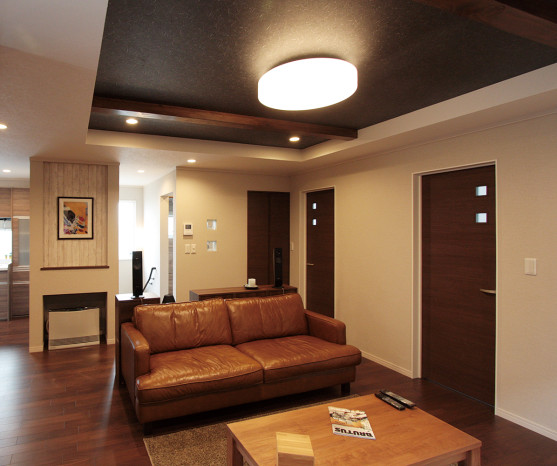 インナーガレージスタイルの家では、2階のリビングが生活の中心となります。ダークブラウンでまとめた室内は、構造梁を表したおりあげ天井と3本の化粧柱が空間にゆとりと変化をつけています。テレビの裏の壁は調湿作用のある黒色のエコカラットでデザイン性を高め、テレビボードやパソコンカウンターを造作でつなげて、実用性のある落ち着いた大人の時間を楽しめる空間になりました。