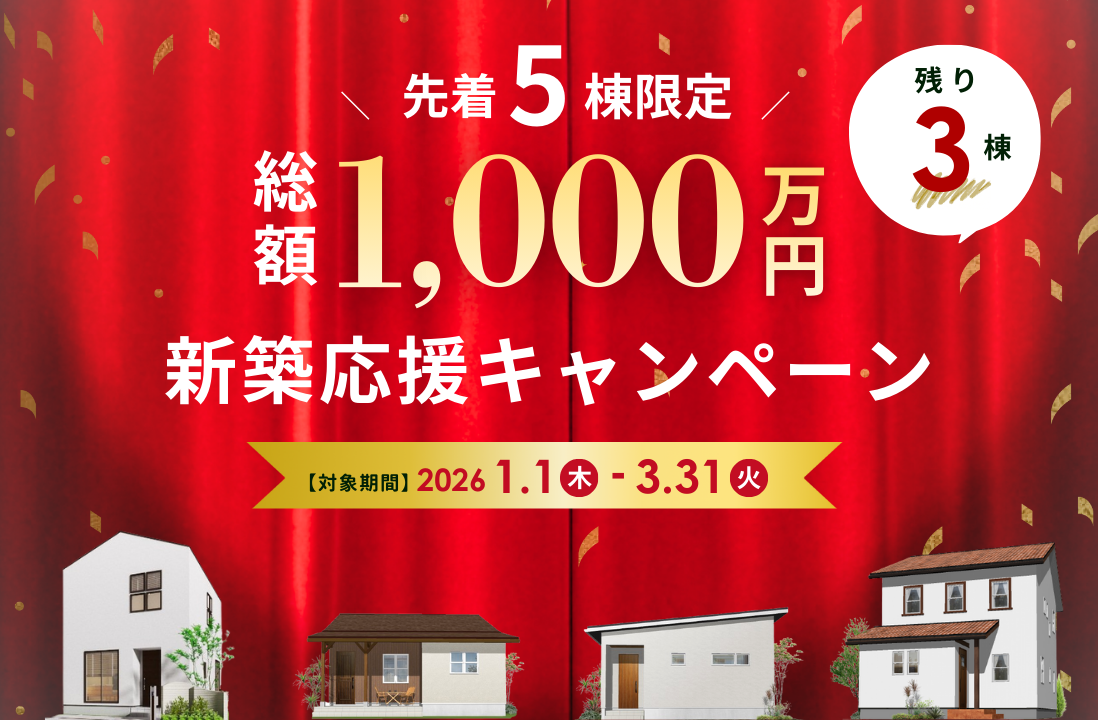 \ 先着5棟限定→残り3棟! / 総額1,000万円 新築応援キャンペーン