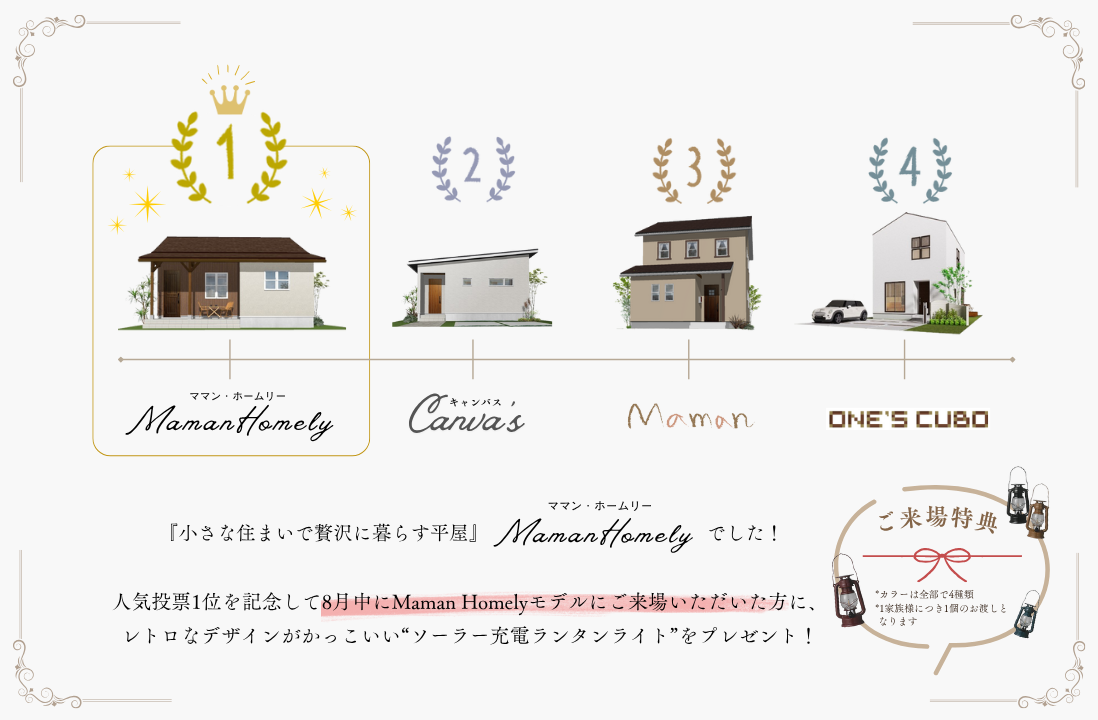 そこで、人気投票1位を記念して、8月中に長岡市五反田町のMaman Homelyモデルにご来場いただいた方に、レトロなデザインがかっこいい「ソーラー充電ランタンライト」をプレゼント!