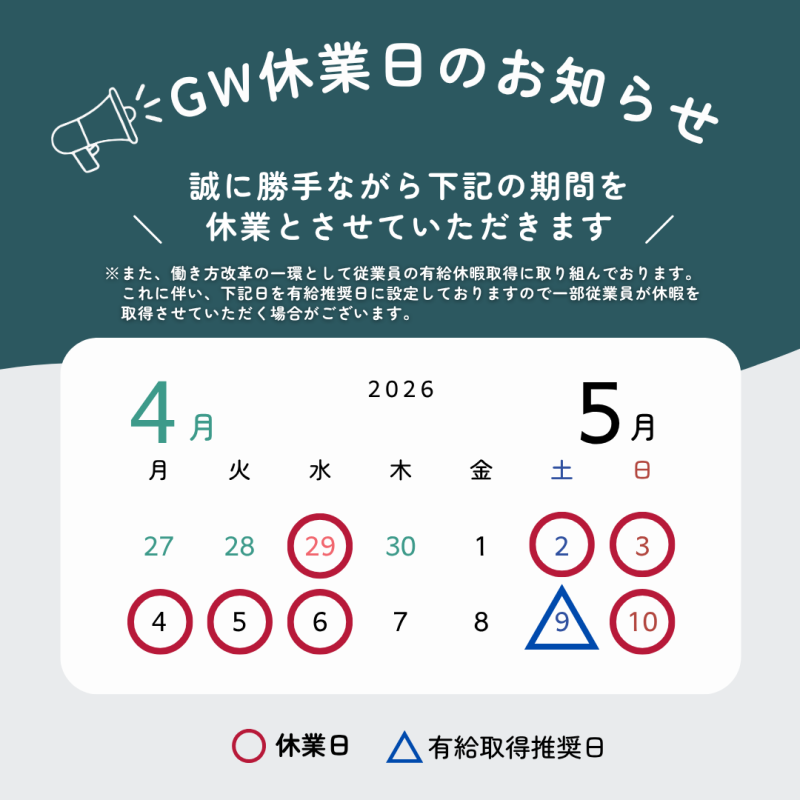 ※また、弊社では働き方改革の一環として、従業員の有給休暇取得に取り組んでおります。これに伴いまして、次のとおり有給奨励日を設定しておりますので、一部従業員が休暇を取得させていただく場合がございます。