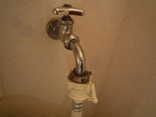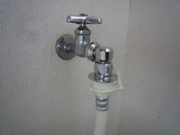 古い蛇口に洗濯機接続のアダプターが取り付けてあり、そのアダプターが緩んで外れたようです。