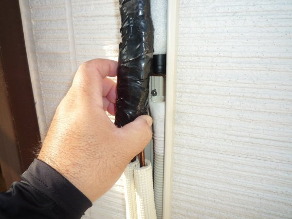 冷媒管と共に室内機から外部に出たところでジョイントしてあります。
