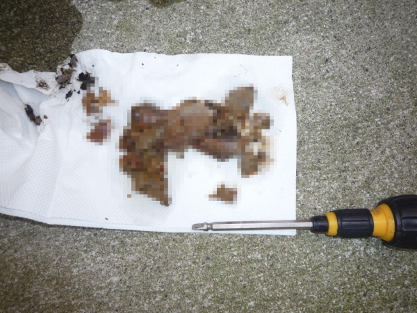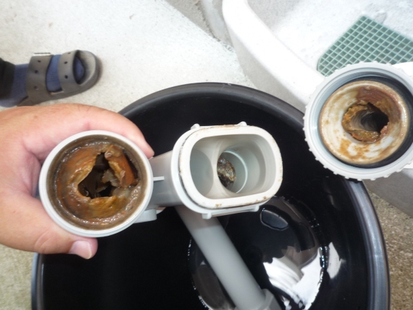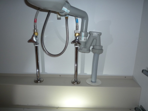 排水口の先、シンク下には、配管や排水トラップ装置等があり、少し水が溜まるようになっています。
