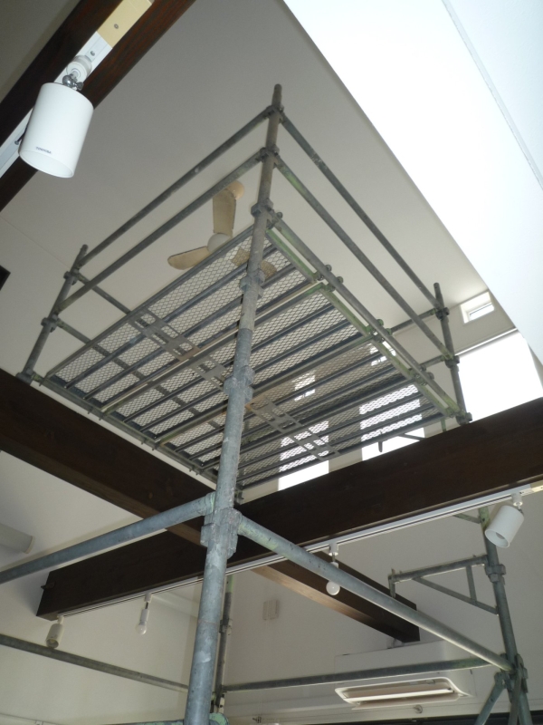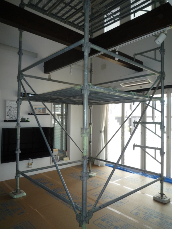 一般の照明交換とは異なり、高さがあるため、まずは室内に足場を組むところからスタートです。
