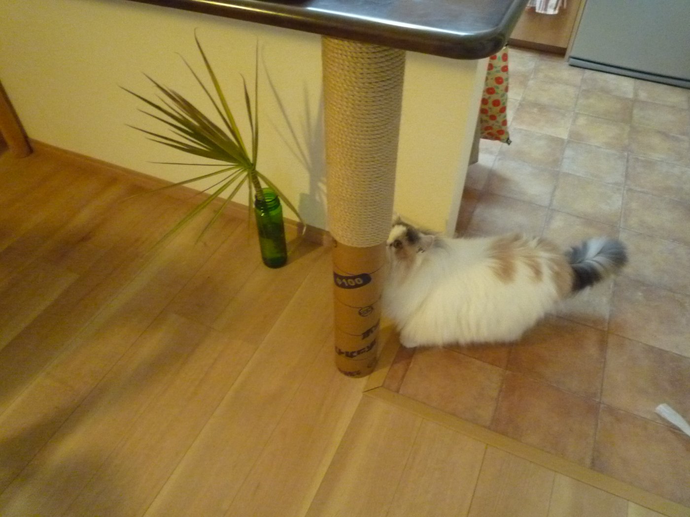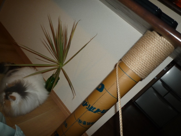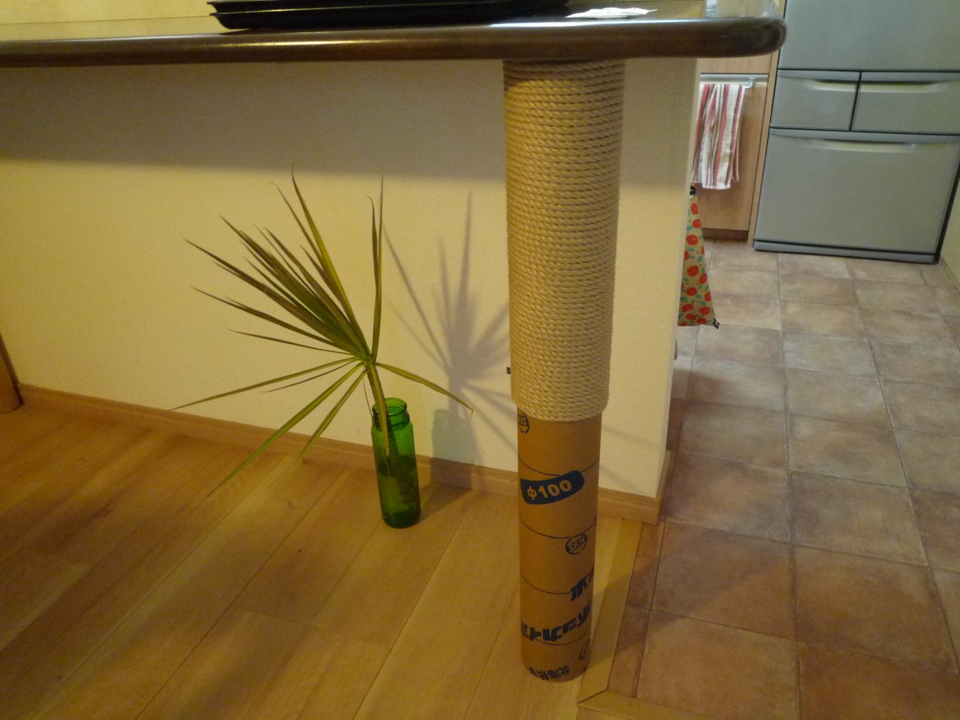 そこで目を付けたのが、カウンターテーブルの支柱。この支柱をうまく利用して、より安定した爪とぎを作ることにしました。